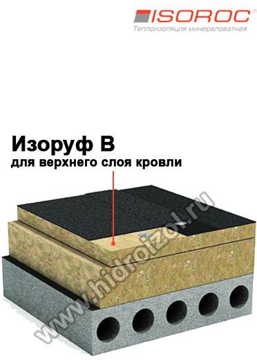 Чтобы кровля смогла при эксплуатации выдерживать нагрузки без вреда для своей целостности и для целостности кровельного и гидроизоляционного покрытия, Изоруф В используется как верхний утеплительный слой. Это относится к системам двухслойного утепления плоских нагружаемых кровельных ковров. Для нижнего слоя выбирают в таких случаях менее плотный, но не менее надежный утеплитель - Изоруф Н. Укладку Изоруфа В выполняют на предварительно уложенные плиты Изоруф Н таким образом, чтобы плиты перекрывали все места соединения предыдущего утеплительного слоя, а затем фиксируют телескопическими дюбелями. Поверх материалов Изоруф В монтируют гидроизоляцию и кровельные материалы, чаще всего на битумной основе.
